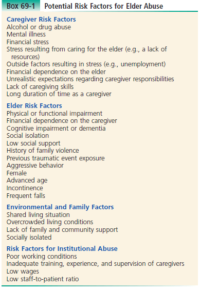Caregiver risks – promoting abuse; risk factors placing the elders for abuse; environmental factors; institutional abuse risks