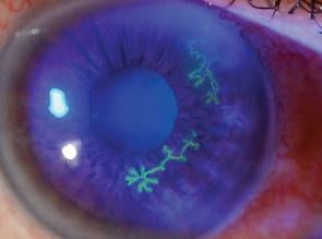 - Foreign body sensation, tearing, intense pain photophobia, blepharospasm