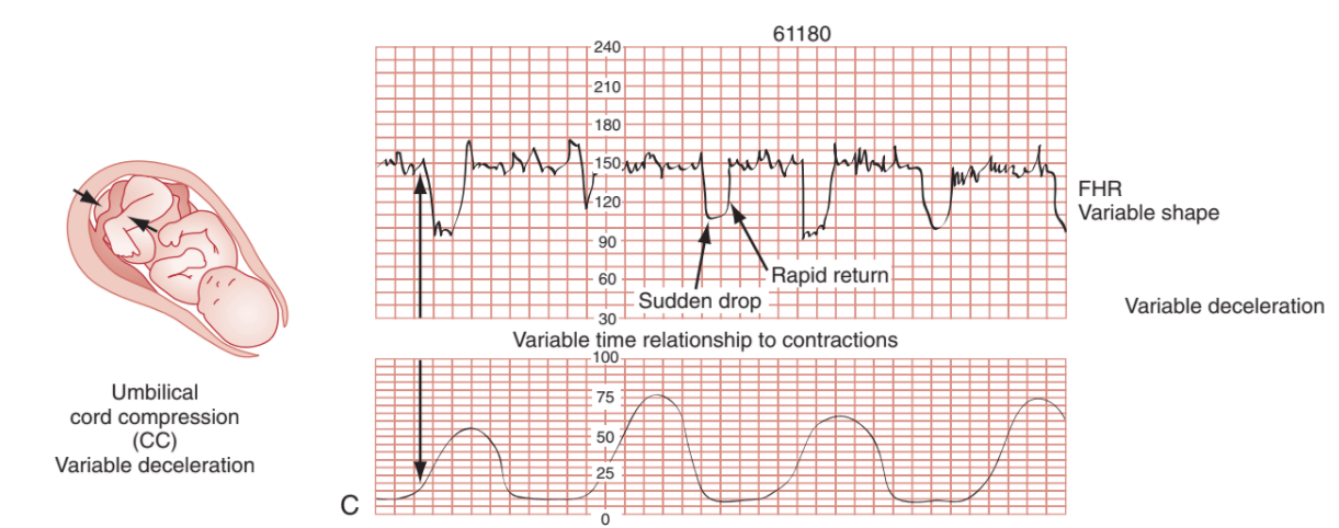 | Variable decels: ● Sudden drops ● FHR variability ● Rapid return to baseline ● Unrelated to contractions | ![]() | Watch; if persistent may lead to fetal hypoxia and distress;