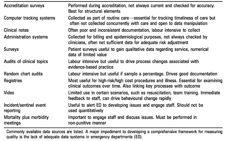 There are numerous methods to collect data on quality. They vary in terms of scope and labour intensiveness as they pertain to different needs. Figure 2 is a summary of a variety of methods that can be used to collect quality data. Having a routine and standard way of quality data collection is essential to understanding the quality of care in your ED.